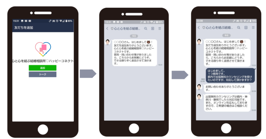 LINEでは、婚活に関するご質問や無料カウンセリングのご予約を、気軽にお送りいただけます。